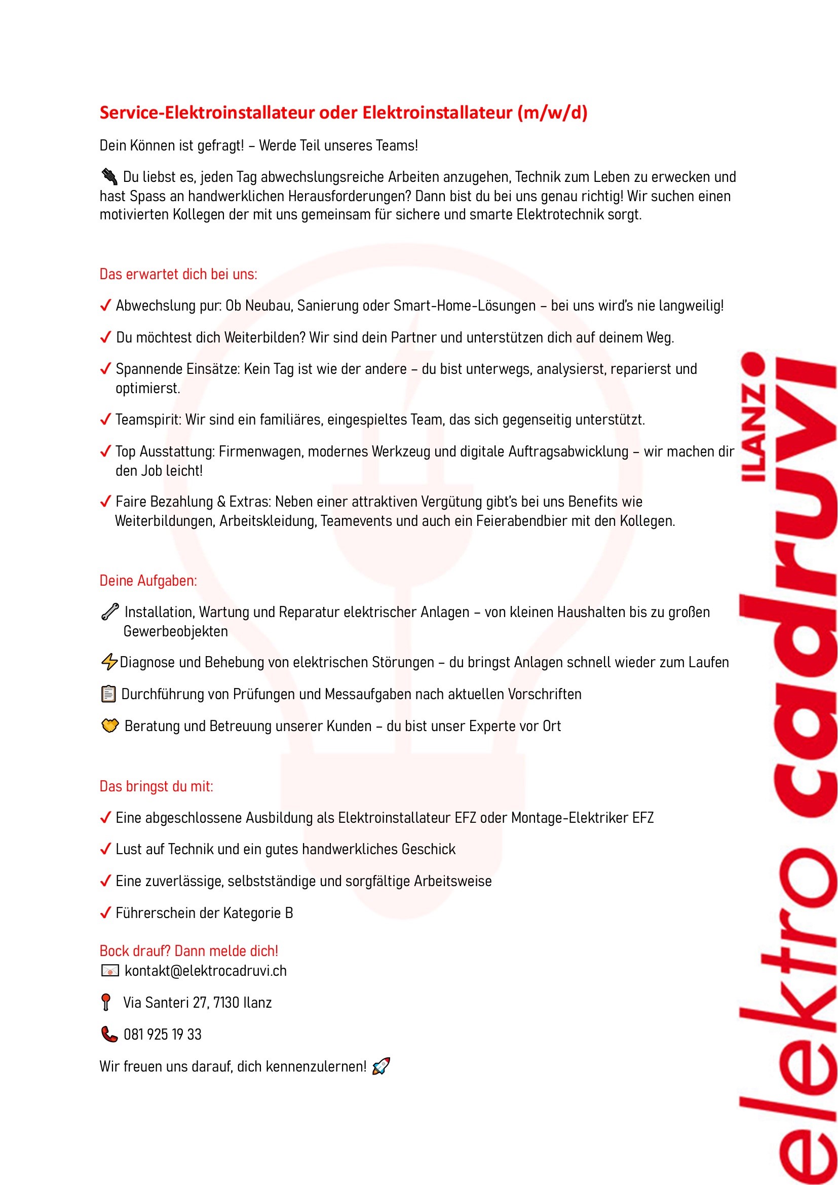 Wir bieten seit über 30 Jahren die gesamte Palette der Elektro-Dienstleistungen an. Sowohl Installationen als auch Service und Unterhalt der Anlagen für private und gewerbliche Kunden gehören zu unseren Kompetenzen. Jede Arbeit wird mit Sorgfalt und Fachwissen ausgeführt. Ein Ladengeschäft an der Via Santeri 27 in Ilanz rundet unser Angebot ab. Zu unseren Spezialgebieten gehören unter anderem: